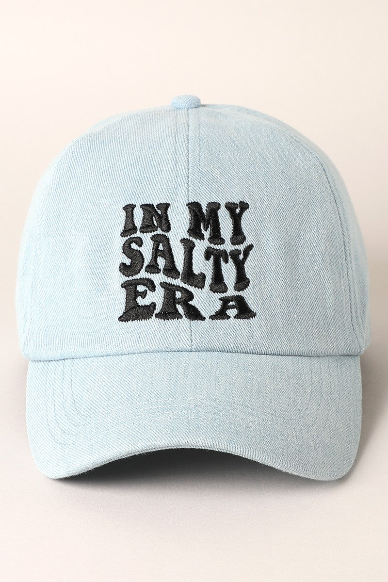 Rock the salty vibes with this embroidered baseball cap featuring a playful "In My Salty Era" letter design. Made from 100% cotton, this adjustable denim cap is perfect for any day at the beach or casual outing. One size fits most.