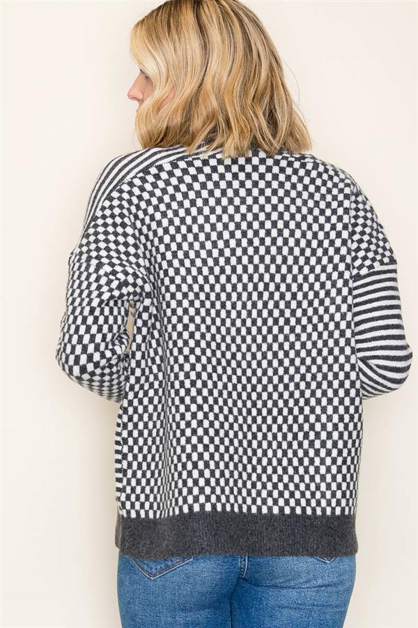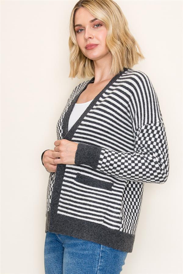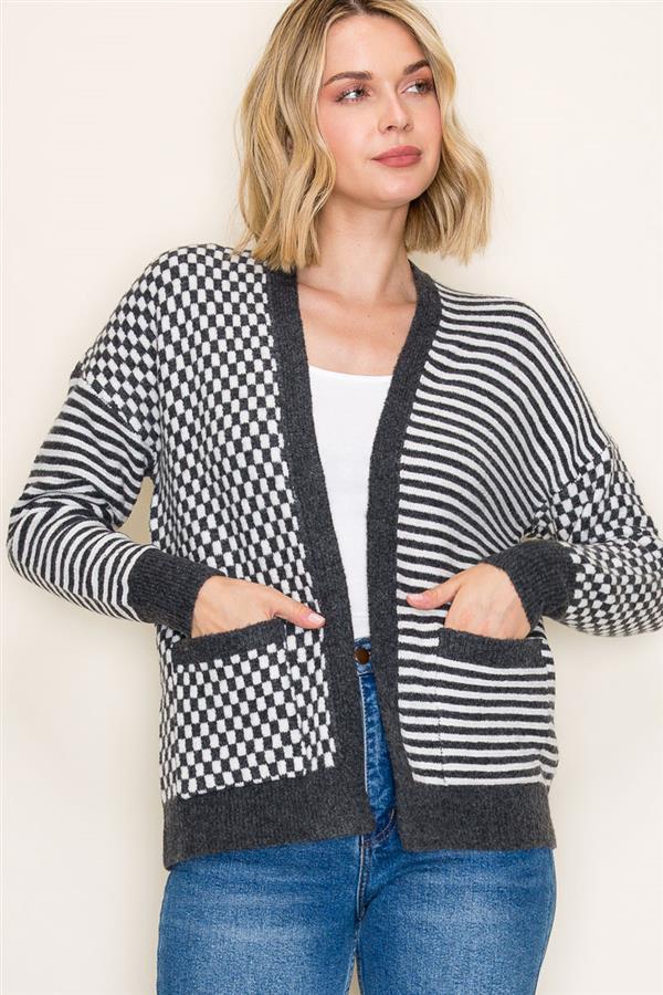 Stay cozy and stylish in the Aleaha Mix Pattern Cardigan, featuring a cool blend of checkerboard and stripe designs. This long sleeve, open front sweater has convenient pockets for keeping essentials close. Its relaxed fit makes it perfect for laid-back days or layering up with ease.