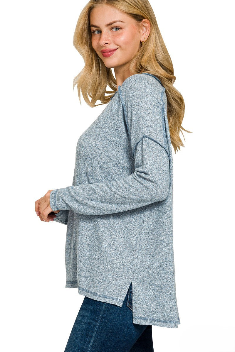 The Annalise Exposed Seam Hacci Top features a relaxed fit with a trendy hi-low hem and side slits for easy movement. Its soft melange fabric feels cozy and comfortable all day. The exposed seam detail adds a cool, casual edge to your look.