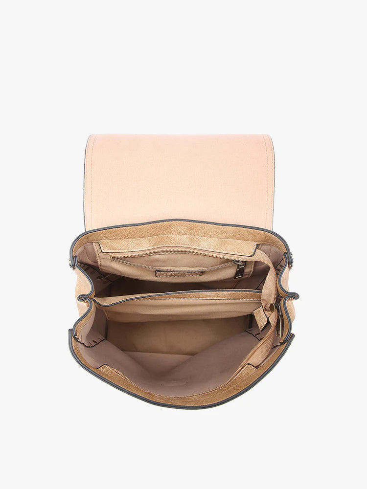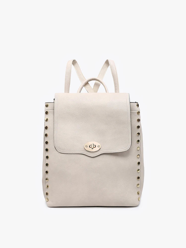Make a statement with the stylishly distressed look of the Bex backpack! Featuring intricate studded details, this backpack offers a blend of edgy charm and practicality. It includes a flap-over with a twist-lock closure, adding a touch of sophistication to its design. The backpack boasts two spacious compartments to accommodate your belongings with ease. For added versatility, the adjustable straps can be converted to a crossbody style, allowing you to wear it according to your preference. Crafted from durable vegan leather, the Bex backpack offers both style and functionality.
