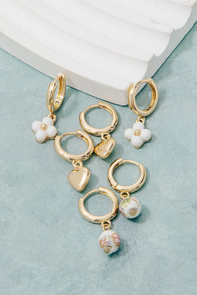 Ceramic Floral Bead Clover And Heart Hoop Earrings Set