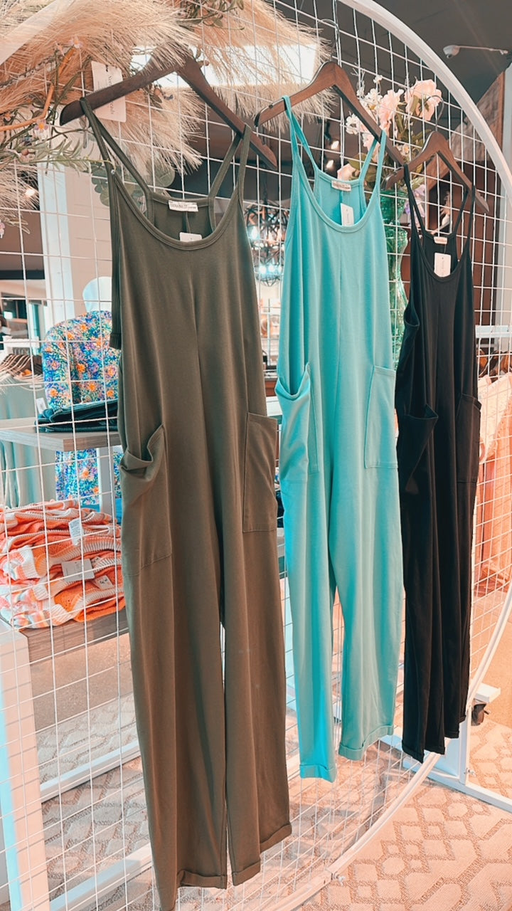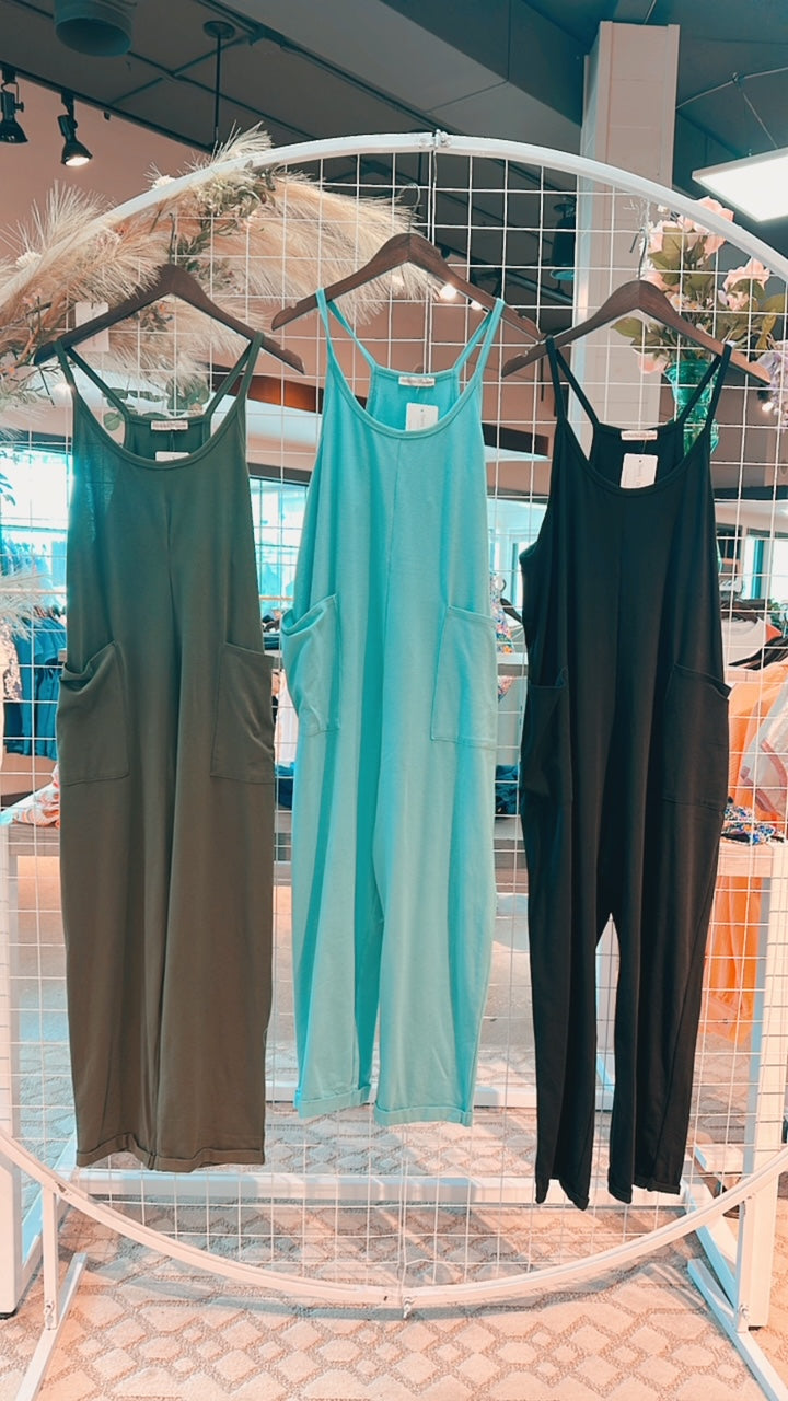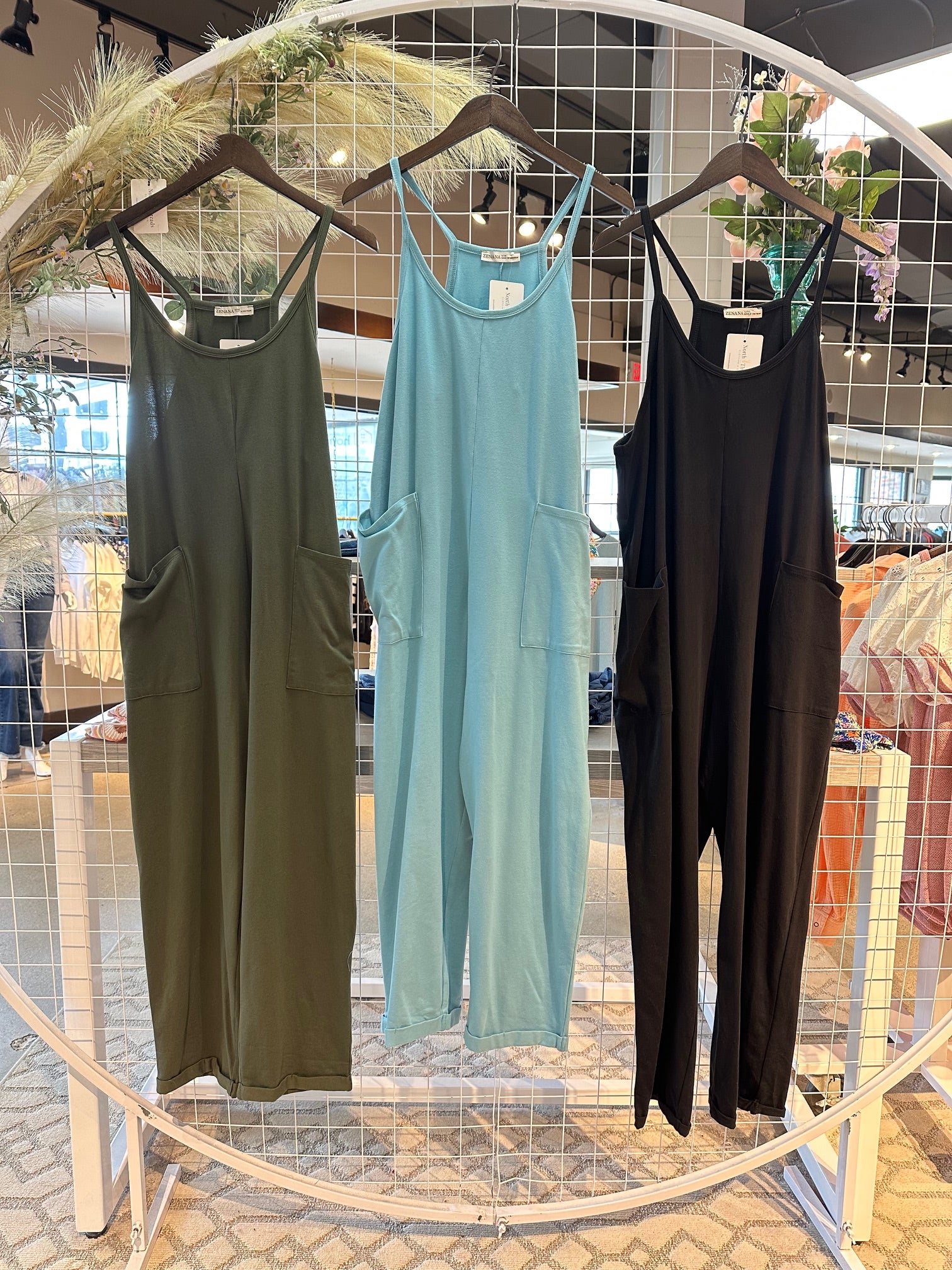 Fall in love with this Essential Love Jumpsuit! With its stretchy knit fabric and relaxed fit, it's perfect for all-day wear. Plus, it features spaghetti straps and pockets for ultimate convenience. Say hello to your new favorite jumpsuit!