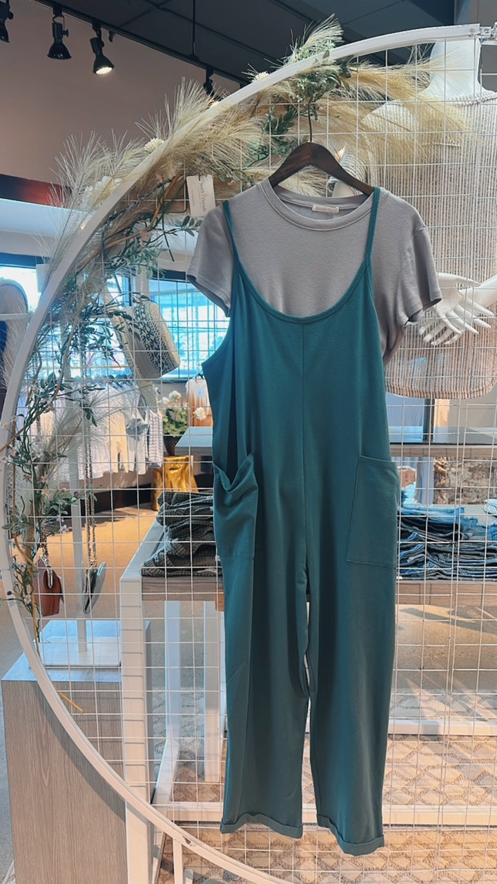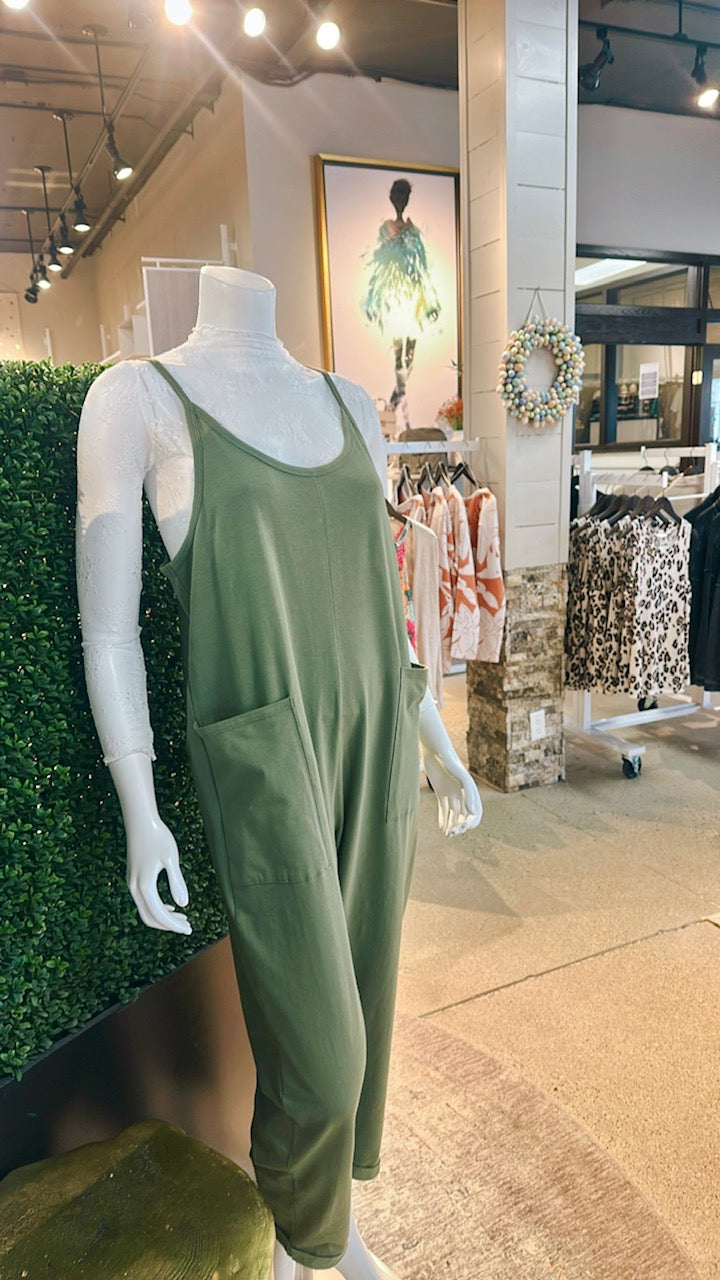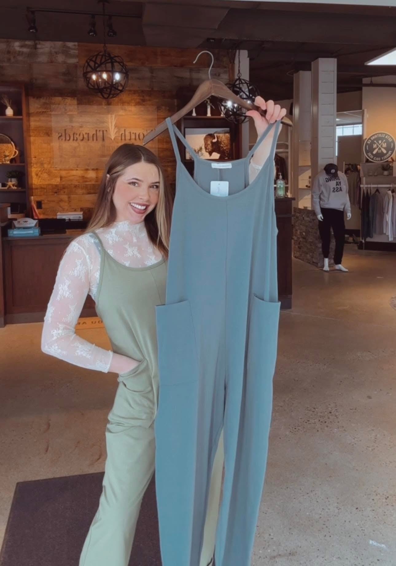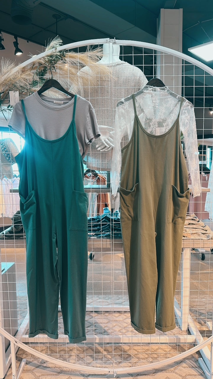 Fall in love with this Essential Love Jumpsuit! With its stretchy knit fabric and relaxed fit, it's perfect for all-day wear. Plus, it features spaghetti straps and pockets for ultimate convenience. Say hello to your new favorite jumpsuit!