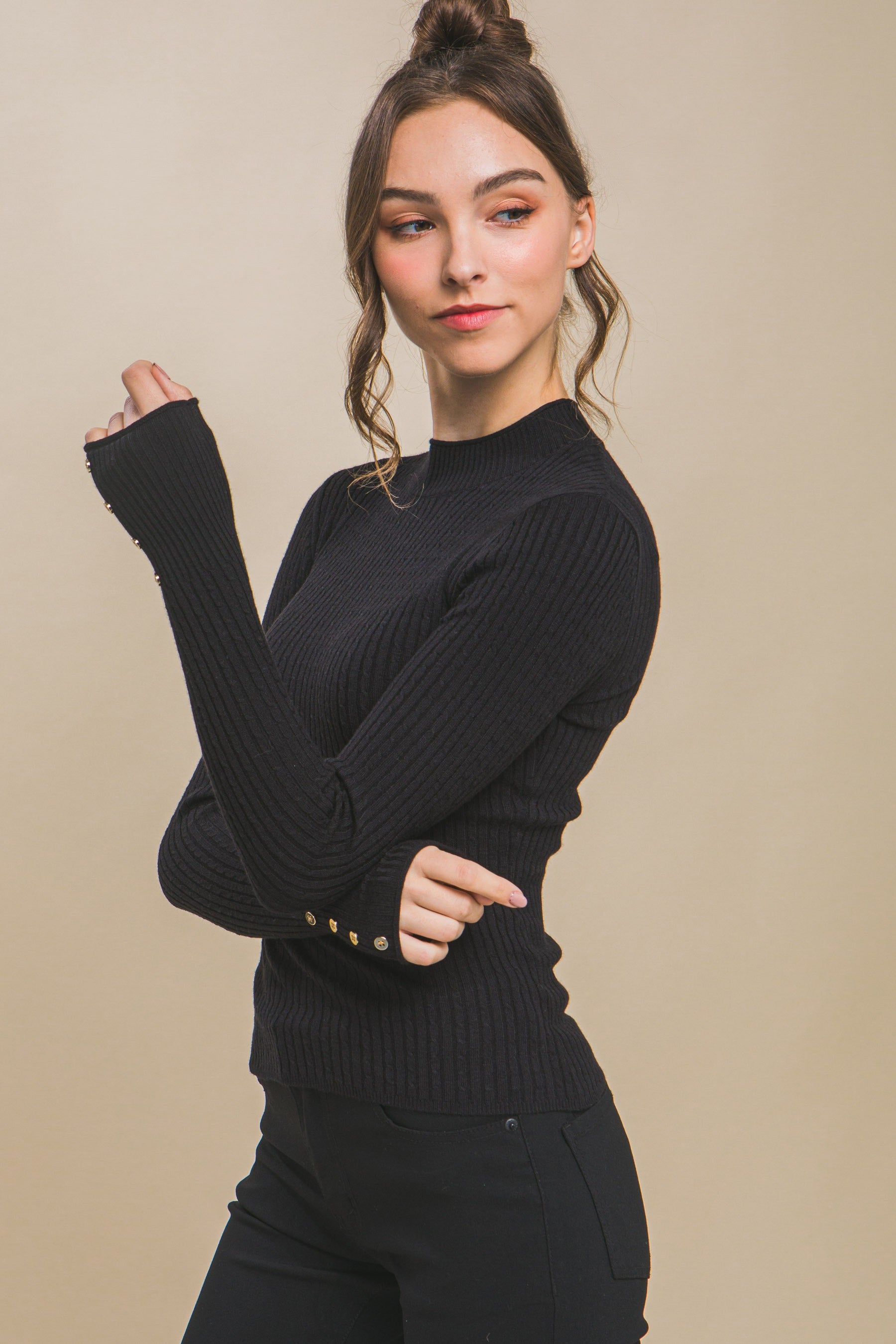 The Fitted Ribbed Knit Sweater is a versatile wardrobe staple available in 3 colors. This fitted ribbed sweater features elegant button detailing on each end of the sleeves, adding a touch of sophistication. Perfect for layering or wearing alone, it provides both comfort and style. Elevate your everyday look with the timeless appeal of the Fitted Ribbed Knit Sweater.