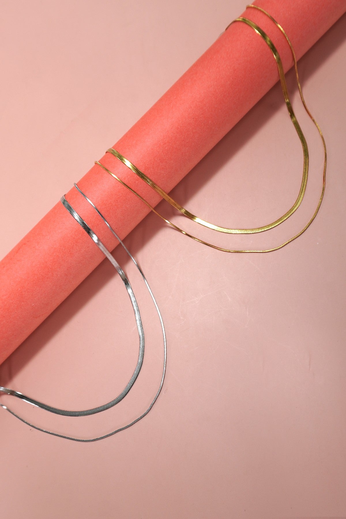 Elevate your everyday elegance with this stunning 18K stainless steel herringbone snake chain necklace. Featuring multiple intricately woven layers that create captivating depth and dimension, this piece combines sophisticated design with practical durability. The radiant 18K gold finish resists tarnishing, fading, and water damage, making it perfect for layering or wearing solo. Available in gold or silver, this hypoallergenic necklace is lead and nickel compliant, ensuring comfort for sensitive skin. At 16 inches with a 3-inch extension and secure lobster claw clasp, it's versatile enough for any occasion—from casual days to special evenings.