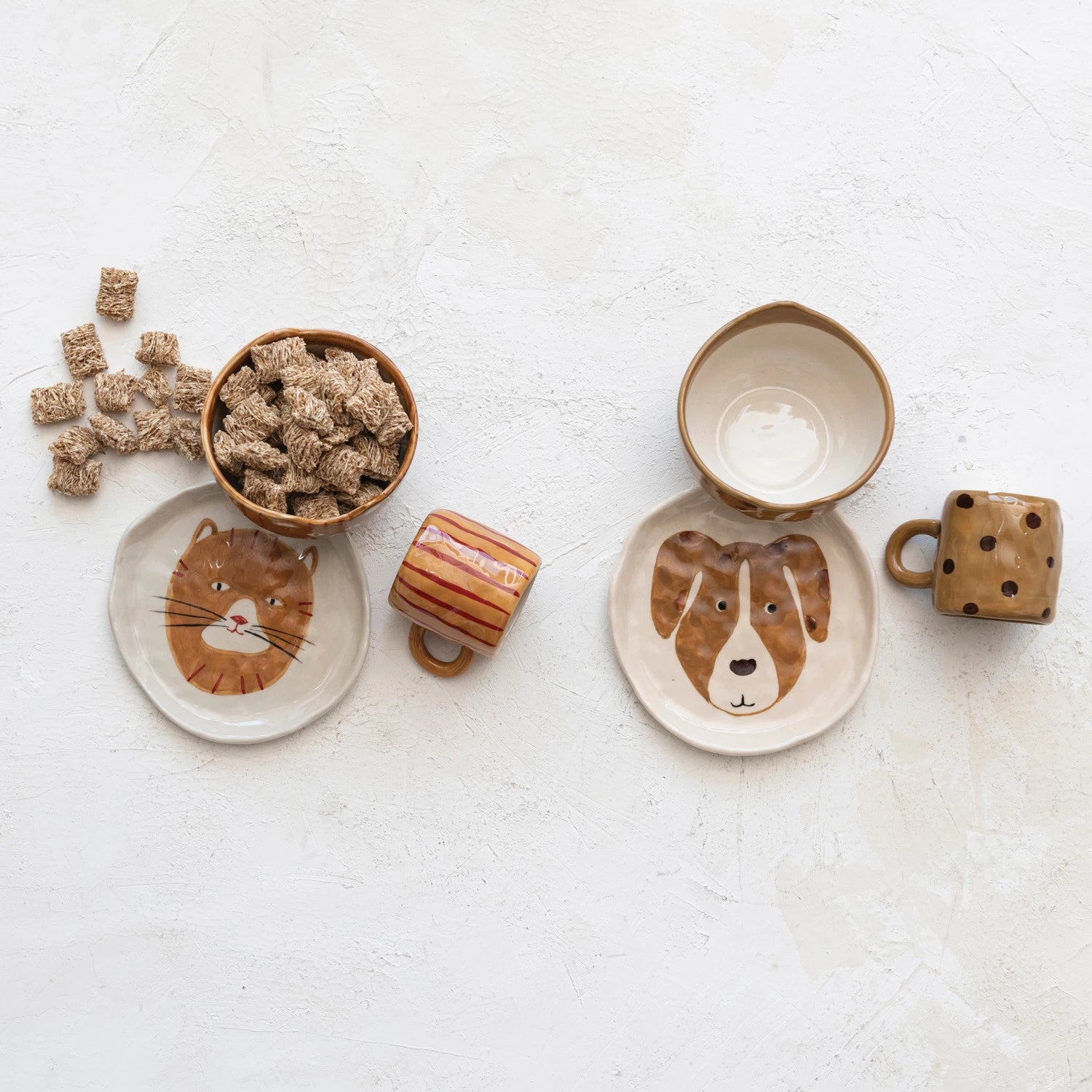 Hand-Painted Stoneware Plate w/ Dog, 4 oz. Mug w/ Spots & Bowl w/ Dog, Set of 3