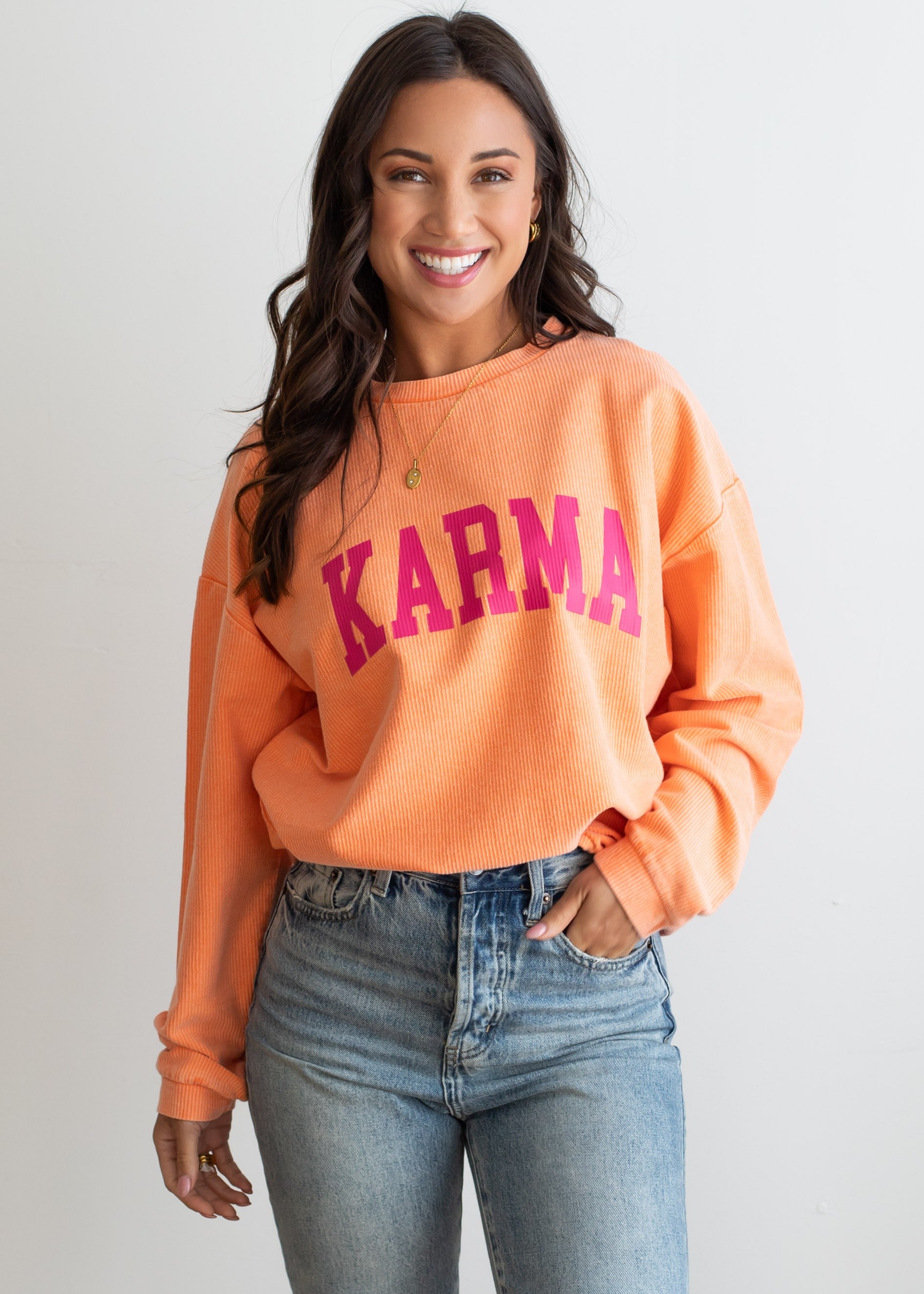 With a playful twist on a classic sweatshirt, our Karma Ribbed Sweatshirt features a trendy orange corded ribbed acid wash design. The pink "KARMA" text on the front adds a fun and quirky touch. Let this sweatshirt be a reminder to spread good vibes and enjoy life (and comfy fashion) to the fullest!