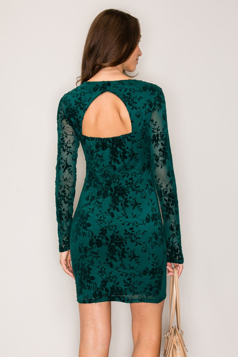 Elevate your evening look with this stunning long sleeve flocked mesh mini dress. The sophisticated boat neckline pairs beautifully with an alluring cutout back detail that adds just the right amount of edge. Crafted from a luxurious flocked mesh fabric with a smooth poly-spandex blend, this dress hugs your silhouette in all the right places with its slim fit. Fully lined for comfort and confidence, it's the perfect length for making a statement. Designed in the USA and imported for quality you can feel. Whether you're heading to a night out or a special occasion, this dress delivers modern elegance with an unforgettable touch.