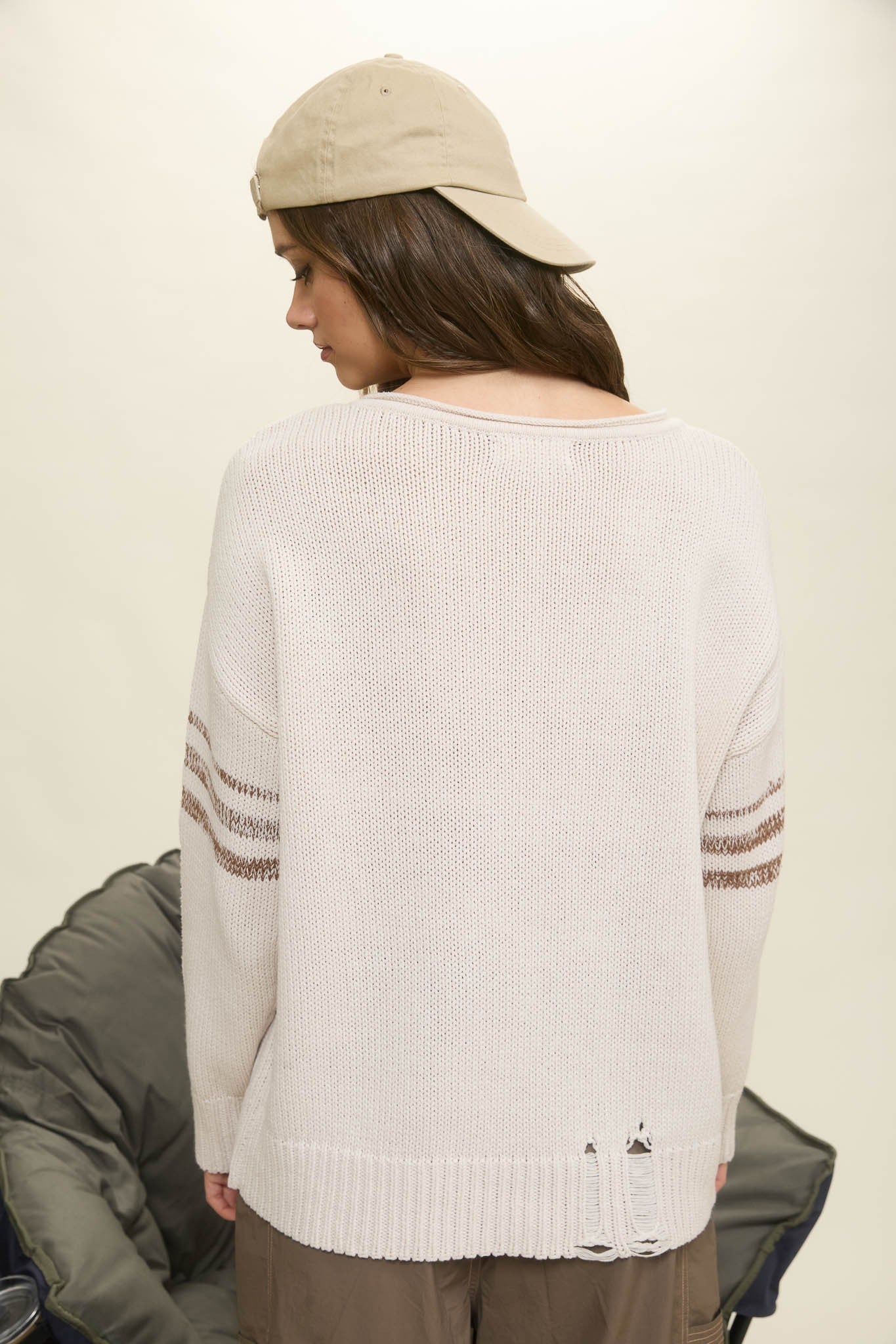 The Number 80 Distressed Varsity Knit Top offers a relaxed fit with a cool, casual vibe. Featuring a boat neckline, drop shoulders, and long sleeves with stripe details, it's perfect for laid-back days. The distressed look and bold number pattern add a touch of vintage athletic style to your wardrobe.