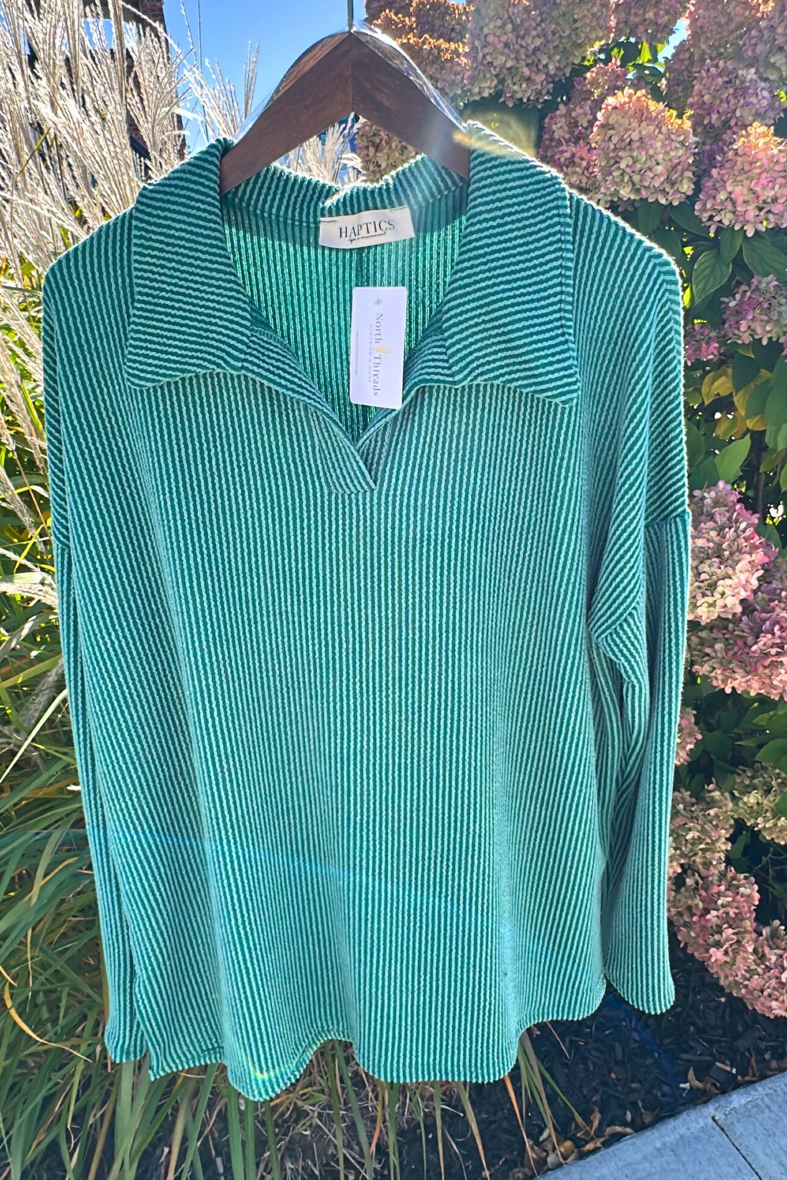 This oversized long-sleeve top features a relaxed drop shoulder and a chic collared notch neckline, delivering effortless style and comfort. Crafted from a soft wavy rib knit blend of polyester, rayon, and spandex, it offers a gentle stretch and a flattering loose fit. Its washed solid finish adds subtle texture, making it a versatile piece perfect for layering or standing out on its own. Elevate your casual wardrobe with this effortlessly stylish and cozy knit top.