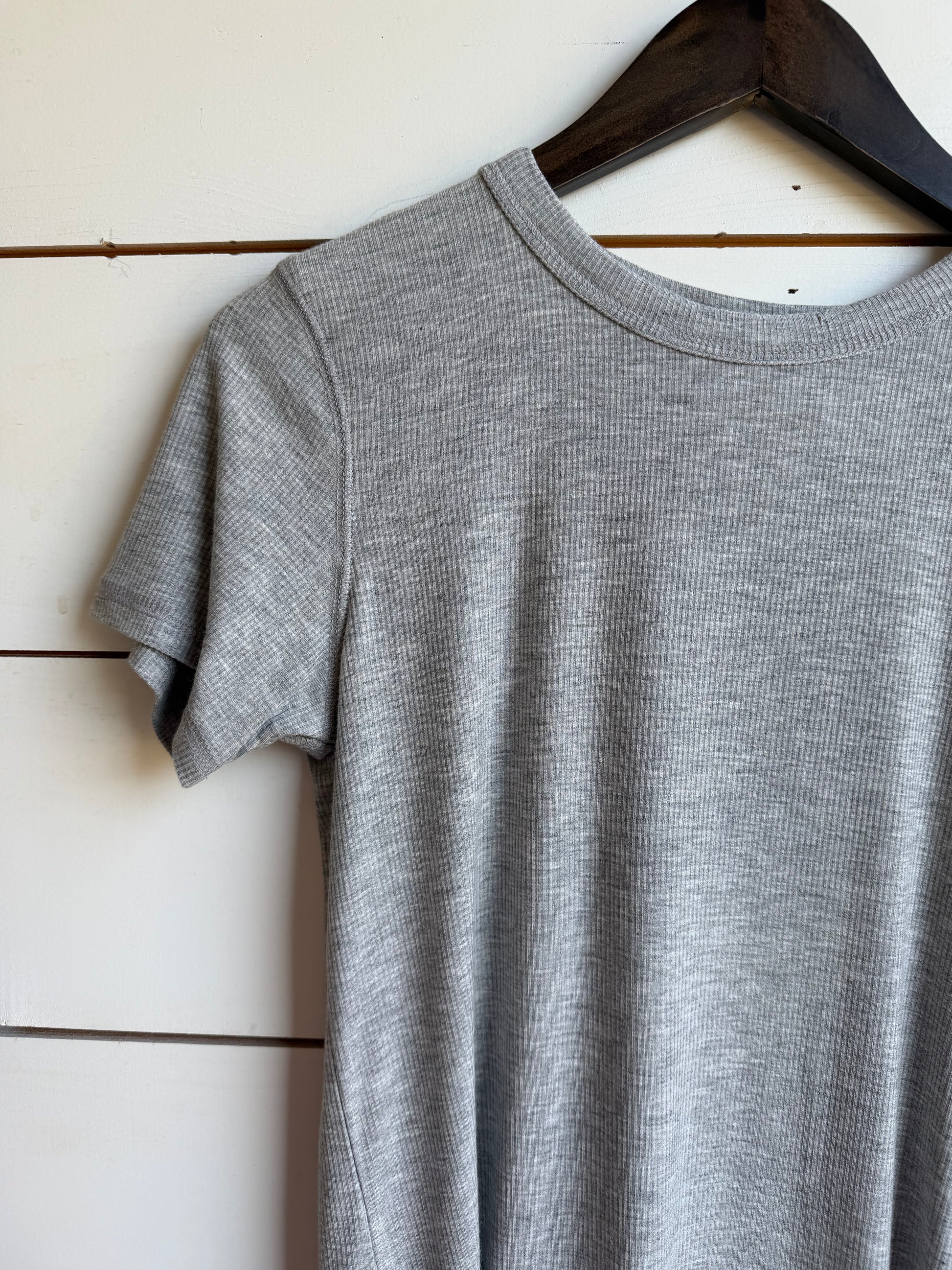 The Ribbed Curved Hem Tee is the perfect everyday essential with a flattering, modern fit. Designed with a classic round neckline and soft ribbed texture, this tee offers a comfortable feel while elevating your basic look.