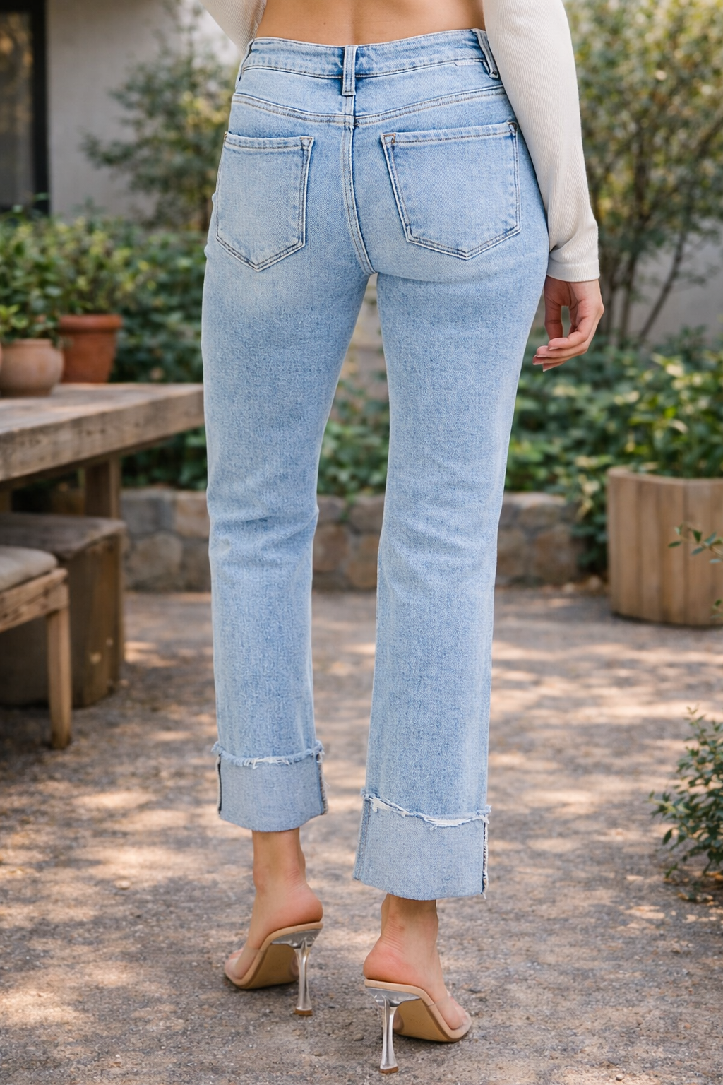 The high-rise waist creates a sleek, flattering silhouette, while the straight leg cut delivers a timeless, versatile look that pairs effortlessly with everything from sweaters to tanks. Finished with a cuffed hem that can be released, these jeans give you two styling options in one — cropped and cuffed or full-length and straight.