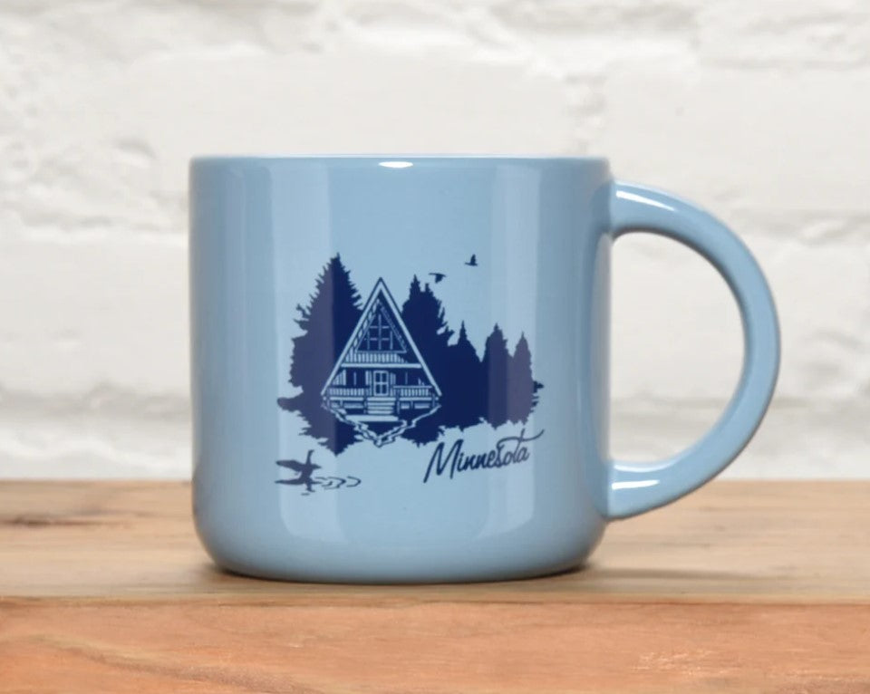 Enjoy your favorite drink in the pale blue SOTA A-Frame Ceramic Mug, featuring a charming navy blue cabin design. Its cozy 14oz size is perfect for morning coffee or evening cocoa after an adventure. Bring the feeling of the great outdoors to your kitchen—no bug spray needed!