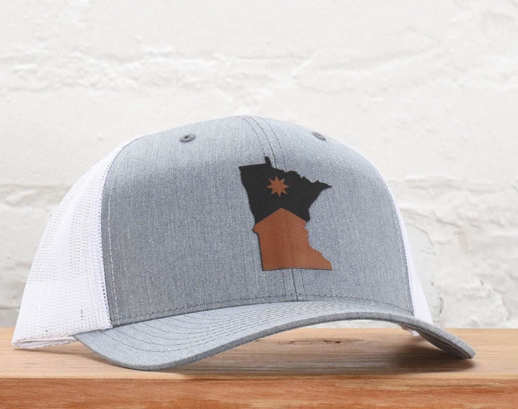 Classic trucker style meets Minnesota pride. This snapback features a bold leather patch of the state outline, complete with a star marking the heart of it all. Easy to wear, hard not to love—built for cabin days, city strolls, and everything in between.