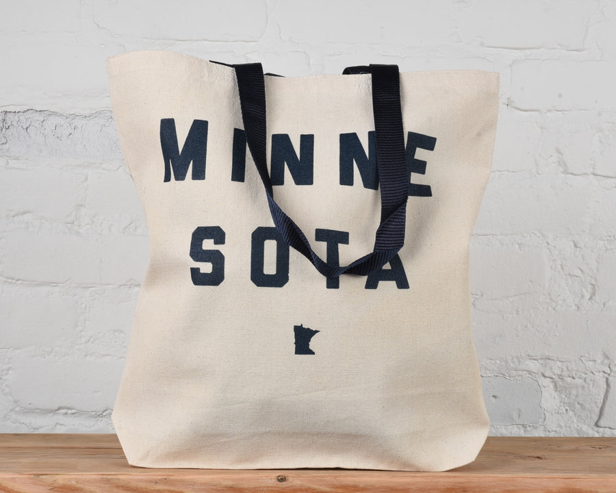 Your new favorite companion for every market run! This handy market tote is designed to keep close and use a lot, crafted from natural canvas for a durable yet stylish look. The bag features bold navy blue handles that provide a comfortable grip, and a playful "Minnesota" print in navy blue that proudly displays your love for the North Star State.