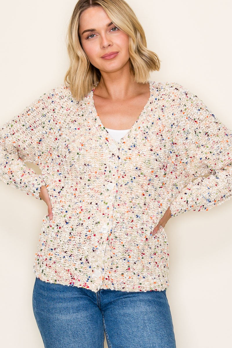 Wrap yourself in cozy cheer with the Speckled Happiness Popcorn Cardigan. This playful sweater features a vibrant multicolor popcorn knit, a flattering V-neck, and charming button-down front—all topped off with comfy long sleeves. Perfect for adding a pop of joy to any outfit, it’s your new go-to for warmth and fun style.