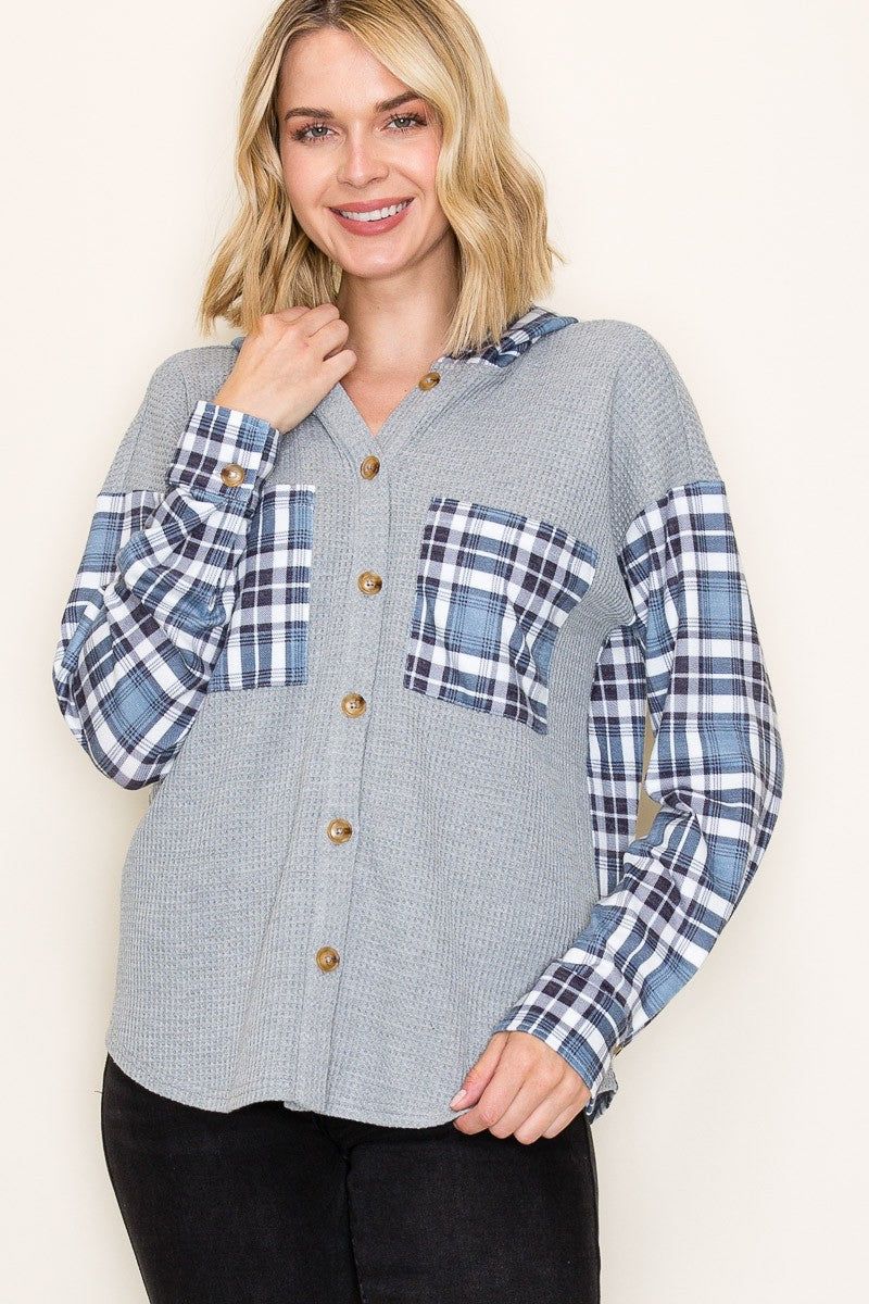 Cozy meets cool in this playful waffle knit hoodie shirt featuring bold plaid contrast and double chest pockets for extra style and storage. The button-down design adds a classic touch, making it perfect for layering or wearing solo on breezy days. Available in two vibrant colors to brighten up your casual wardrobe!