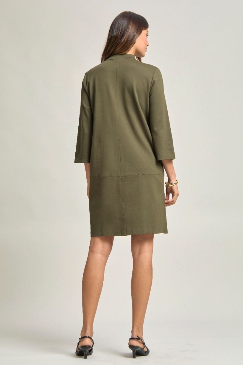 This A-line dress features a sleek Mandarin collar and is crafted from our Magic ponte fabric, combining comfort with a polished look. Its timeless style makes it a versatile choice for both work and casual outings, effortlessly fitting into your everyday wardrobe.